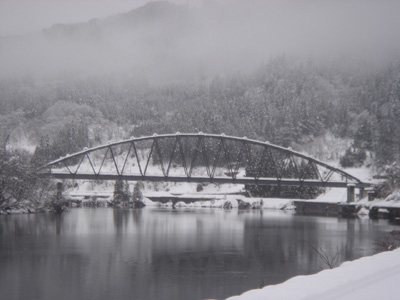 米坂線は、これまた深い山間を縫って走る風光明媚なローカル線である。この時期は、豪雪に埋もれた山と川と林、そして時々現れる小さな街が描く、水墨画の車窓である。