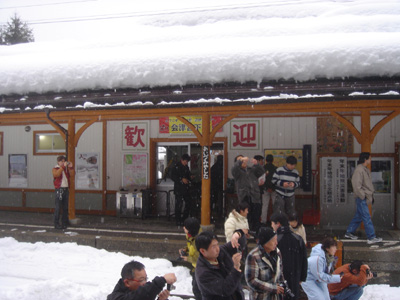途中、会津宮下駅と会津川口駅で上り列車を待つために15分ほどの停車がある。只見線は単線なので、上り列車と下り列車が駅ですれ違うのだ。これらの駅で電車が停まると、鉄ちゃんたちはドアに殺到して電車を降り、電車や風景を夢中で撮り始める。僕も彼らに混じって写真を撮りまくる。そして、雪が積もったホームの喫煙所でタバコを一服。