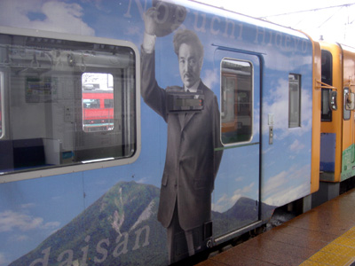 只見線の向かいホームには、会津鉄道の電車が停まっている。車体には野口英世の写真が描かれ、合わせ、千円札に肖像が採用された2004年の記念日が記載されている。彼は猪苗代の出身、この土地の英雄なのだ。会津鉄道は、ここから南へ向かい、湯野上温泉、塔のへつり、田島等南会津方面を結ぶ路線である。