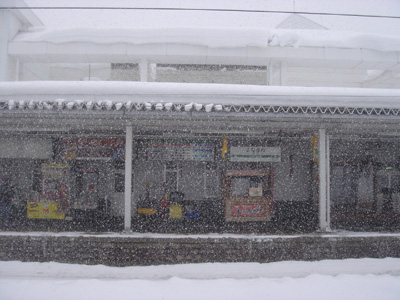 駅から、今日泊まる予定の民宿『ふる里』に電話をする。しばらくして、宿のお父さんが運転する迎えのバンがやってくる。このお父さんの話では、今年は雪が多い方だという。だけど、今は主要道路には消雪がある(道にスプリンクラーが設置され、水で雪を溶かしている)ので、少なくとも車道には雪はなく、車で外に出れるので、昔と比べれば不便さは全くなくなったという。昔は、外に出るのに、かんじきを履いて、雪を固めながら歩かねばならなかったのだ。