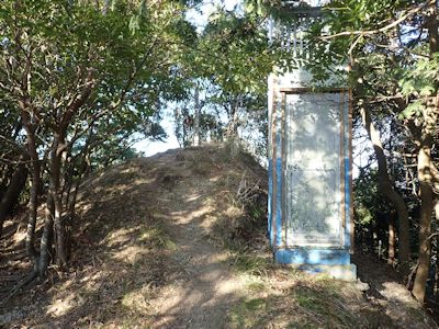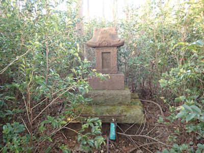 御嶽山山頂の祠。鬱蒼とした藪に囲まれている |