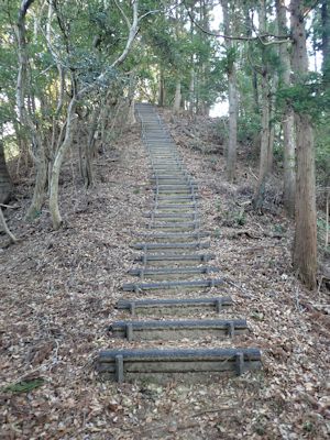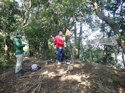 竹林の中を歩き、そのあとしばらく急斜面をジグザグに登る。さらに尾根道を上下しながら南に進むと、ほどなく大山山頂に到達。標高は193.6m。10:15なので、わずか45分で山頂到達。