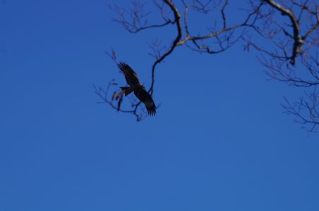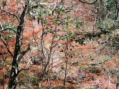 林道を下ると、道に猿がいた。50mくらい先の道を、何か動物が道を横切った。体長50〜70cmほどだったので、始めはテンかタヌキかなにかと思った。左側の斜面に前足を二本上げた姿を見て、猿ではないかとハッとし、前足で木の実か何かを摘んでいるのを見て確信。