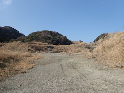 果たして、10分も歩かないうちに山道は林道の終点に吸い込まれる。林道は砂利道の未舗装道路。道端に冬枯れた茶色の草が生い茂っている。しばらくいくと雪道となる。
