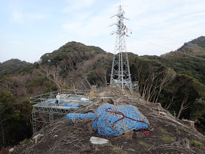 しばらく休憩したあと、下山は北に降りる。電波塔の横を下る。日の当たらない斜面に雪が残っている。