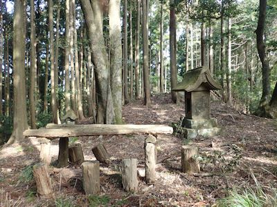 石の祠と丸太のテーブルがある。ベンチは壊れている。
