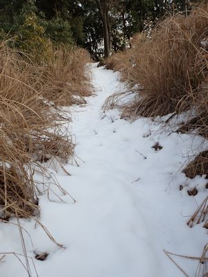 房総とは思えない雪道歩きとなる。道は登りとなり、草の上に積もった10cm程度の柔らかい雪を踏み抜きながら登る。