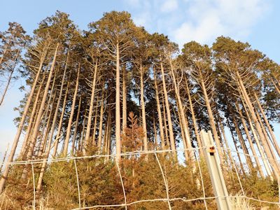 山頂の樹々。フェンスに囲まれている |