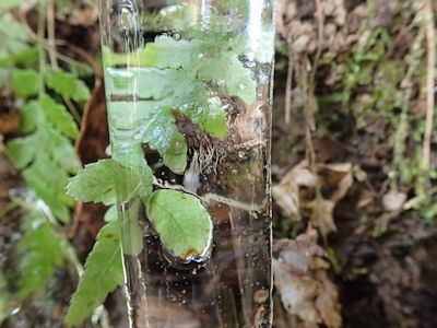 石尊山から北の尾根道で、木の根の下にツララ群 |