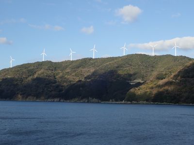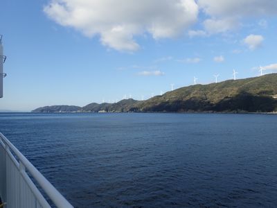 客室に上がり、外の甲板に出て景色を眺める。船は、「日本一細長い」と言われる佐田岬の南岸を西に航行する。山の上に風車群が立っている。青空に白い風車が映える。