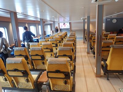きれいなフェリー客室。前方のテレビでは正月番組 |