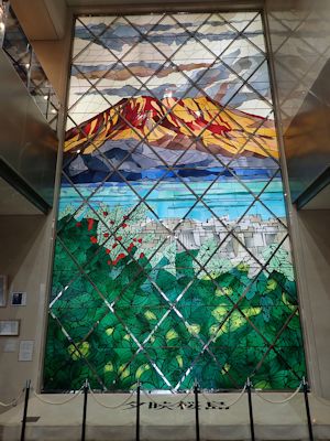 入口を入ると、目の前に巨大なステンドグラスの絵が飾られている。高さ7mくらいはありそうな、「夕映桜島」と題された絵は、鹿児島の街から錦江湾を挟んだ先に、黄金色の桜島が噴煙を吐き出す様子が描かれている。城山展望台から見た桜島のような気がする。