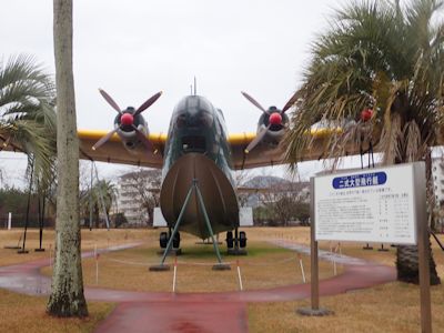 道を挟んで大きな広場に展示されている大きな飛行機を見る。これは、二式大型飛行艇といい、太平洋戦争時に開発され、当時世界最高の性能を持つ傑作機だったそうである。この機体が世界に唯一現存する機体とのことである。