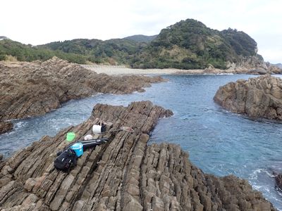 この堤防の東側にある磯にも偵察に行ってみるが、どうも水深が浅そうであまり芳しくない。