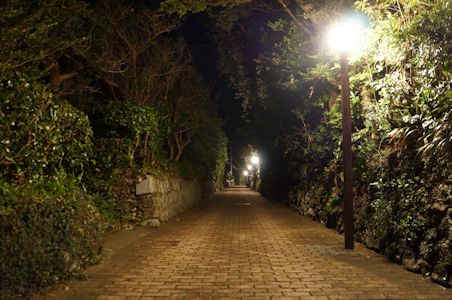 陽が暮れた武家屋敷通りはすっかり様相が変わっている。暖かい色の街灯が並び、誰もいない通りをしっとりと照らし出している。