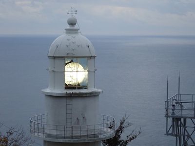 釣掛埼灯台。夕暮れの灯台は、私が着いて、しばらく周りを散策していたら点灯した。巨大なレンズが回り、両側の光が360°回転しながら、船乗りたちに陸地の場所を知らせる。