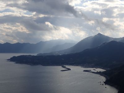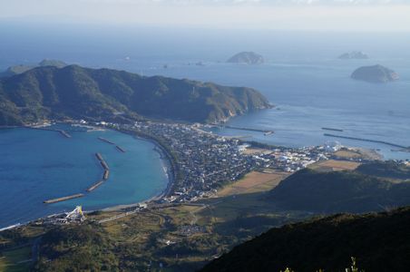 天気がいいこともあり、眺望がすばらしい。眼下すぐに、里の街が広がっている。里のトンボロ地形が手に取るようにわかる。