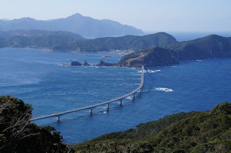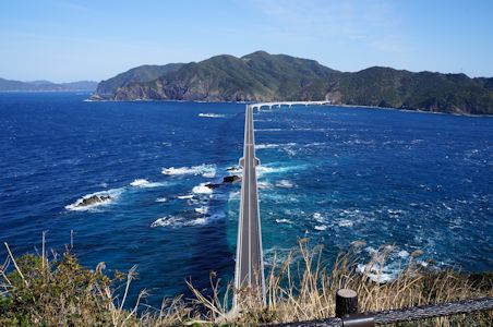 帽子山展望台に上り、平良の街と港を上から眺めた後、さらに南下して、甑大橋を渡り下甑島に入る。甑大橋のすぐ上にある鳥の巣山展望所から、甑大橋を見下ろす。