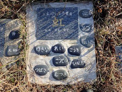 山頂には、里小学校の卒業生たちが、先生と一緒に毎年登頂しているらしく、各学年の石で造られた銘板的な記念碑が地面に埋め込まれている。生徒たちの名前と先生の名前。この山に登ることは里小学校の卒業時の恒例行事なのだろう。各年大体5名〜多くても10名くらいなので、この街の子供の数が知れる。