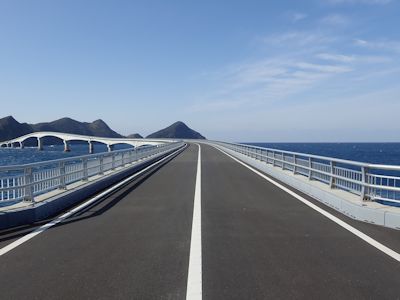 素晴らしい光景。晴れているが、風が強く、、海面は白く波立っている。その荒れ海の上に真っ直ぐと伸びる橋は、人間の強固な意志を反映してるかのように浮かび上がっている。