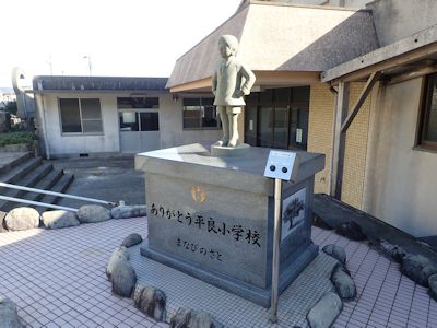 その後、甑島きっての景勝、長目の浜を展望台から眺め、中甑島の平良港周辺の狭い路地をそぞろ歩き、平良小学校では校歌が自動で流れるボタンがあったのでそれを押し、大音響で流れる校歌に驚く。