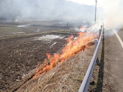 途中、日南市の里山の田園から煙が上がっていた。何かと思って車を停めて野を眺めると、田んぼか畑かを人々が焼いていた。