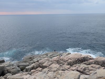 一番下の釣り座から、急斜面の岩場を登っていく。大分上ったところで、はるか左下にいるおじさんが視界に入る。彼はまだ粘っている。左利きのようで、左でコマセを撒いている。