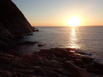 朝4:30起床、内之浦6:45着、いつもの磯に降りて8時から釣り始める。朝日が昇った直後。