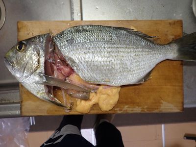 バラ引きでヘダイのウロコを取り、腹を裂くと、真子が出て来た |