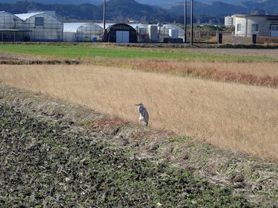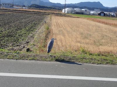 串間に帰る途中、両側田んぼの田舎道で、アオサギが悠々と車道を渡っていた。車が近づいているのにお構いなしにゆっくりゆっくりと道を渡っている。