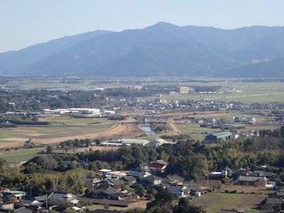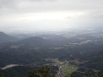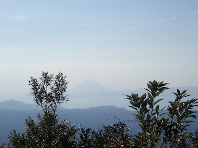 八山岳の山頂から、錦江湾越しにうっすらと見える開聞岳