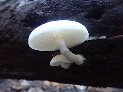 朽木から真っ白いおわん型のキノコが生えている。