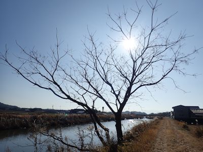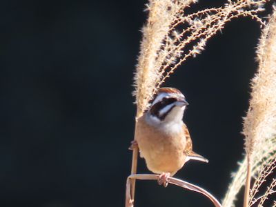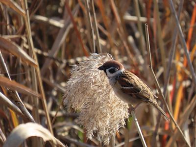 川沿いの密集した葦原は、この時期スズメの格好のねぐらになっているようだ。冬はスズメは群れで生活する。