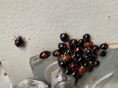 風車の扉の内側にびっしりと集まるテントウムシたち