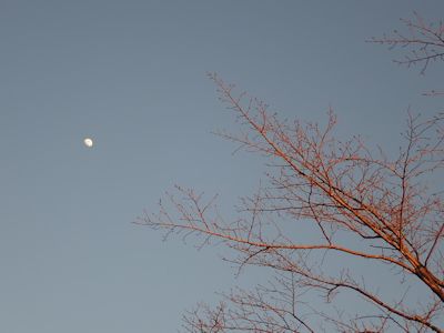西日を浴びる赤い木と登った月
