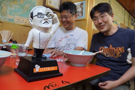 僕らは腹が減ったので何か食べることにする。石坂がスマホで路地裏ラーメンを探す。コンスケが久留里名物、路地裏ラーメン屋があることを知っていたのだ。果たして、どう見ても入り口には見えない、シャッターが1枚だけ開いたような狭いところから入ると、暗い通路を歩いた奥の奥に、怪しいラーメン屋があった。ここでみんなでラーメンを食べる。なかなか美味い。店は祭りの人たちで繁盛している。祭りだからだけではないらしい。この店は、「汚いけど美味い」という店として以前テレビで紹介され、表彰されたことがある味自慢の店なのだ。店の壁には、フテレビ女子アナの名が入った「汚いけどおいしいお店」の認定証が飾ってある。さらに店のおばさんは、その取材のときに授与されたというけったいな人形(料理評論家の人形だろうか)を見せてくれた。