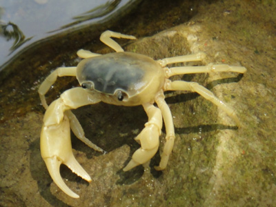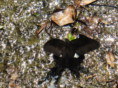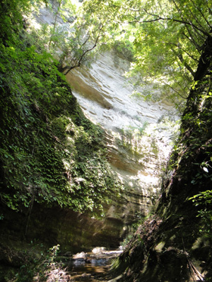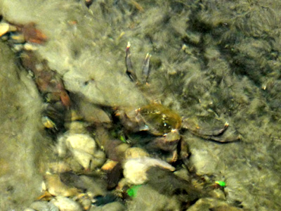 巨大な沢蟹を発見。足の先から足の先まで横幅20cmはあろうかという大物だ。足も身体も茶色で硬い鎧のような身ぐるみ。そういえば七ツ釜渓谷でも川原に巨大な蟹の死骸が裏返しになっていたが、それと同種だろうか。色からしてもいつも見ている小さな沢蟹とは明らかに別種と思われるが、それとも何万匹に1匹くらいの割合でここまで巨大に成長するのだろうか。裕助が石坂をけしかけて捕まえようとするが、逃げ足は速い。