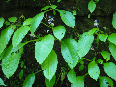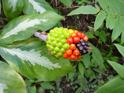 いよいよ出発。トンネルを越えて林道を歩くとすぐに沢に下りる。いきなりとうもろこし風の何というのか、気味悪い実が僕らを迎える。こないだの三間川でも見たが、いかにもまずそうだ。