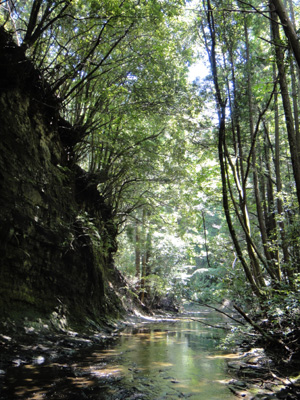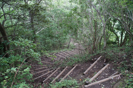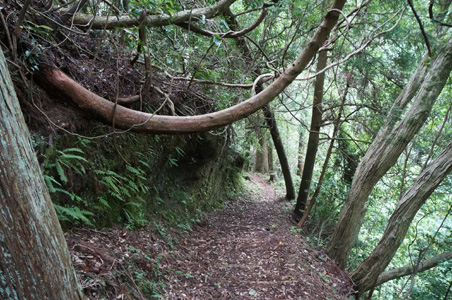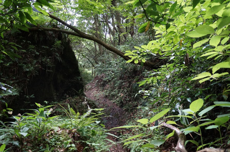 アップダウンが激しい。普通登山といえば、ジリジリと登っていって時々急坂があり、それの繰り返し、というところが多い。っていうか、尾根縦走なんかじゃない普通の登山は、山頂まで基本的に道は上り坂なはずだがだが、ここは登ったら一気に急降下する、それの繰り返し。ちょっと下ってまた登り、という感じではない。延々と本格的に急坂を下がるのだ。侵食された谷を何度も越えている感じだろうか。房総半島を形成する地盤は柔らかく、過去何万年にも渡って侵食が進み、沢筋が縦横に走り、谷は深い。