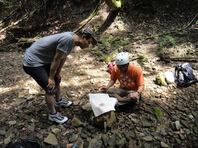 地図を広げて現在位置確認と尾根に上がる場所の目星をつける |