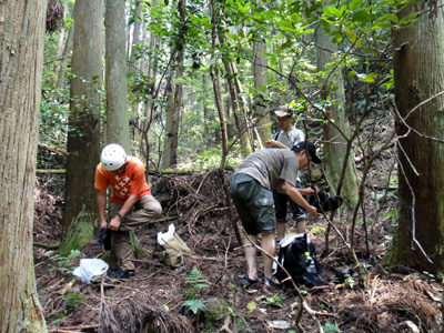 8時半に千葉を出発。久留里の吉田屋で弁当とお茶を買いこみ、三島神社へ。鹿野川を遡上したときに拠点とした怒田沢(ぬたざわ)集落に再び車を止める。ここに、林道高宕線の終点がある。ここから歩き始める。午前11時過ぎ。