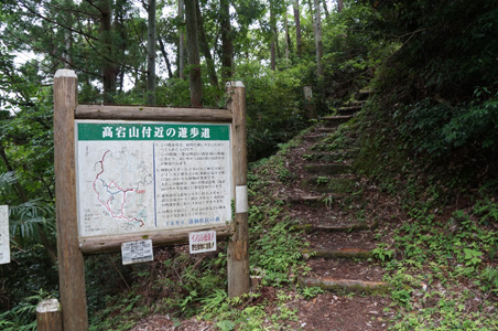 さて、あとはこの登山道を南に歩いて高宕山に登るだけだ。だが高宕観音手前の登り坂と石段がとてつもなく辛い。石段を上がると、朽ちかけた一対の狛犬と一対の不動像が建っていて、さらに石段が続く。息を切らしながらゼーゼーいって登り、ようやく高宕観音に到着。ここで晴れて昼飯。13時。観音堂の中で弁当を広げようとしたところで別の方から登山者が上がってきたので、堂の脇に設けられた通路に移動して食べる。スズメバチが飛んでいる。怖ぇ。