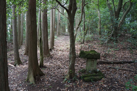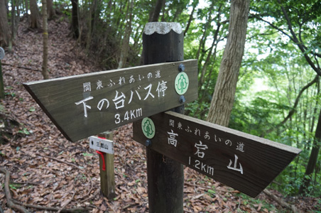 高宕観音を再び通り、今度は登山道を北へ向かう。尾根の縦走だ。標高は徐々に低下しているので、基本は下り坂。そして石射太郎の登り口で道が分岐していて、僕らは「関東ふれあいの道」の本道には進まずに、「宇藤原」という手書きの表示の道に入る。実はここで僕らは方向的に考えてさらに別にある分岐道に入ろうとしていたのだが、ここで携帯の電波が入ったので、念のために過去同じようなルートで山行した人のホームページをチェックしたら、間違った道を行こうとしていることが分かったのだ。あやうくさらに余計な体力を使うところだった。14:25。