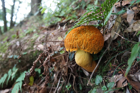 時々気味悪い巨大キノコが単独で生えている。その一つは、こぶし大の大きさで、脳味噌のようなしわ模様のグロテスクな茶色の傘を誇示している。