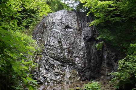 35分ほど歩くと下の方からサーっと瀬音が聞こえてくる。高宕大滝へ到達。ここは林道の終点となっていて、いきなりガードレールつきの舗装された橋に出る。この下の川が小糸川支流の高宕川(※注)で、すぐ切り立った高宕大滝の滝口だ。かなりの落差がある。滝に正対するには、横の巻き道を降りていく。下から見上げる大滝は、黒光りする立派な威容だった。感じは梨沢大滝に似ている。黒いギザギザの縞が入った岩を光らせて、向かって右側に2筋の水が滑り落ちている。落差は10mくらいだろうか。