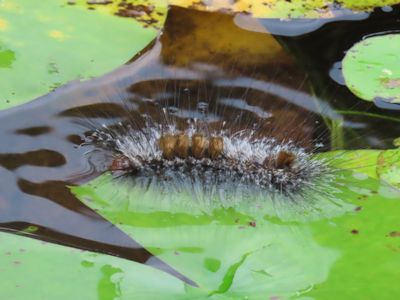 蓮池の蓮の葉の上には、ケムシが蠢いている。チョウかガか分からないが、蓮の葉を食べるのだろうか。普通なら水に落ちたらヤバいと思うが、平気で水に浸かっている。
