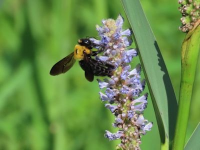 ポンテデリアの花で吸蜜するキムネクマバチ