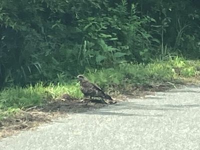 前方の道にトビが降りていた。後から分かったが、足で獲物を