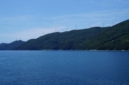 三崎港到着前、佐田岬の風車群。とてつもなく天気がいい。暑い