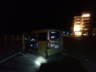 野島崎の駐車場に車を停め、助手席まですべてフルフラットにし、マットを敷き、枕に毛布で寝ようとするが全然寝れない。車内は広々として足を存分に伸ばせるし、妙な段差などなく完全なフラットなので、眠れないのは狭いからとか窮屈だからというわけではない。きっと、N−VAN初の車中泊で、神経が興奮してしまっているのだろう。